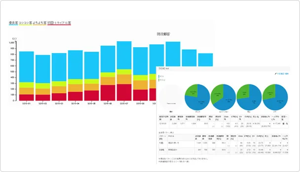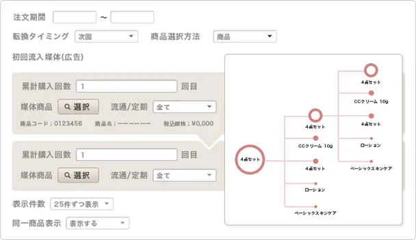 商品転換率分析画面より各商品の転換率を購入回数ごとに確認したところ、転換タイミングに沿った訴求ができていないことがわかりました。