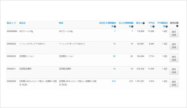 入口商品分析画面より入口商品ごとの顧客の平均継続回数をみたところ、特定の商品を除き、継続回数の低い商品が多いことがわかりました。