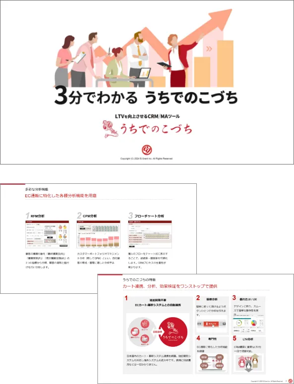 EC通販システムとの自動連携を行い、顧客分析からCRM施策・効果検証までEC通販CRMに必要な機能を提供するうちでのこづち。