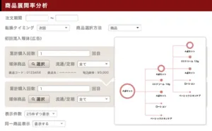 商品のクロスセル・アップセル状況を見るための分析手法です。どの商品を購入した顧客がどの商品へとアップセルしやすいのか?それは何%なのか?など顧客の買い回り・LTVを高めるための具体的な分析になります。