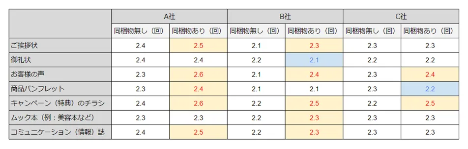 上記の結果から、この7つの同梱物はほとんどの企業でその効果がみられることが判明しました。今回この調査で特に効果があったのは「お客様の声」と「キャンペーン(特典)チラシ」です