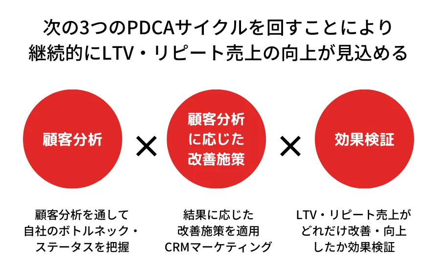 上記の3つを順番に行うことで、着実にCRM施策を進めLTV改善に向かいます。CRMは情報の収集、一元管理、分析まで出来るため使いこなせればとても力を発揮するツールです。