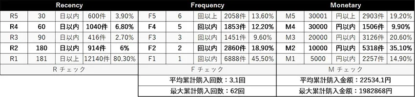 また、F軸で購入回数ごとの転換率を明らかにすることでF2転換率やF3転換率などもすぐに把握することが可能です。累計購入回数や累計購入金額を平均としてみることで、どの層を優良顧客とするのか、顧客の定義を決めることも可能になります。