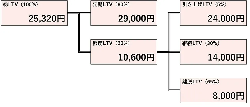 LTVは上記の表のように購買ステータスごとに管理すると全体LTVへの影響度合いがすぐに試算できるようになります。