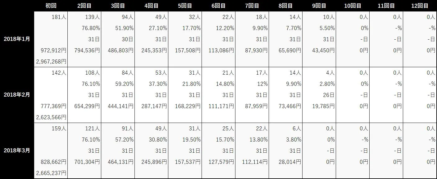 回数別の継続率を見ると、季節要因やキャンペーン(オファー)の効果を長期的に追うことができます。この「キャンペーンの効果を長期的に可視化する」ことを行えている企業は少なく、可視化することによりCPO、CPAの運用からLTVの運用へ容易にステップアップすることができます。