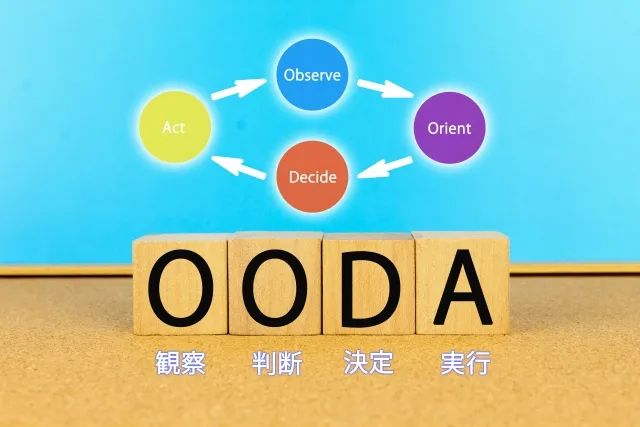 OODAは、Observe (観察)、Orient (状況判断、方向づけ)、 Decide(意思決定)、Act (行動)の頭文字をとったもの。目的・目標を叶えるために自分自身で判断して、素早く行動するための思考法のことを指します。