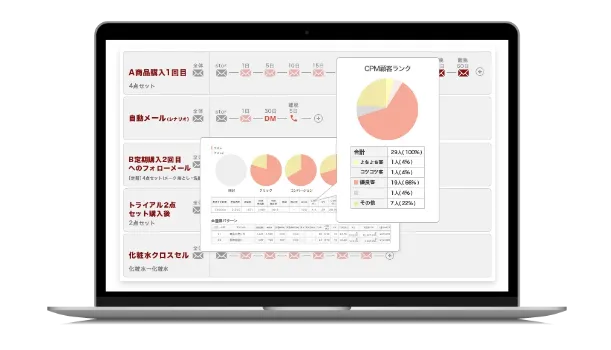 ドラッグ&ドロップで直感的に扱えるエディターと、HTMLメールテンプレートが利用できるため、初めてでも簡単にメールマーケティングが行えます。開封率やクリック率などのデータは見やすいレポートにまとめられ、円グラフなど視覚的に分析しやすい形で活用可能です。