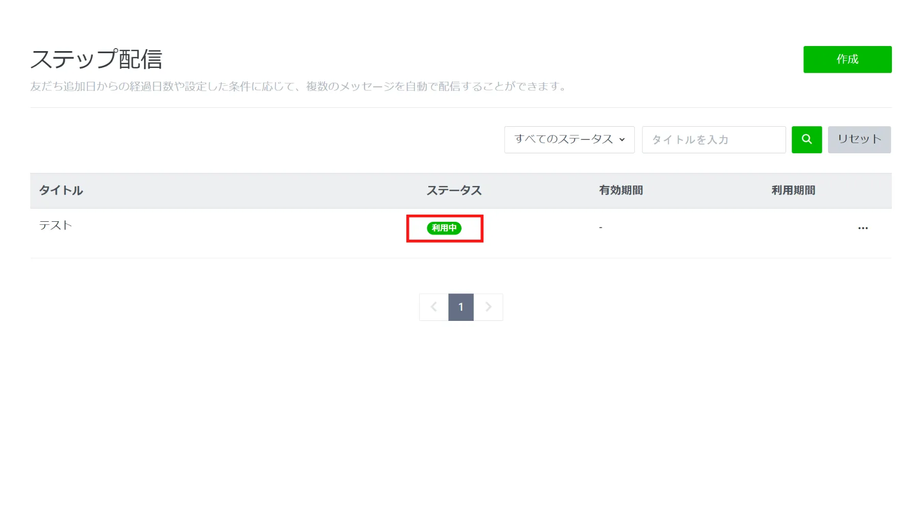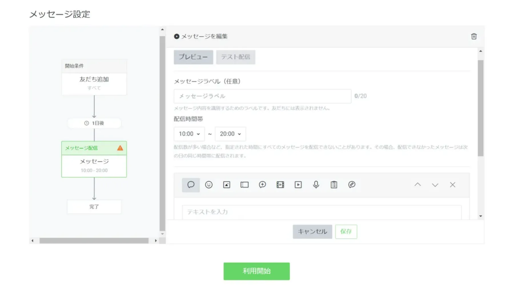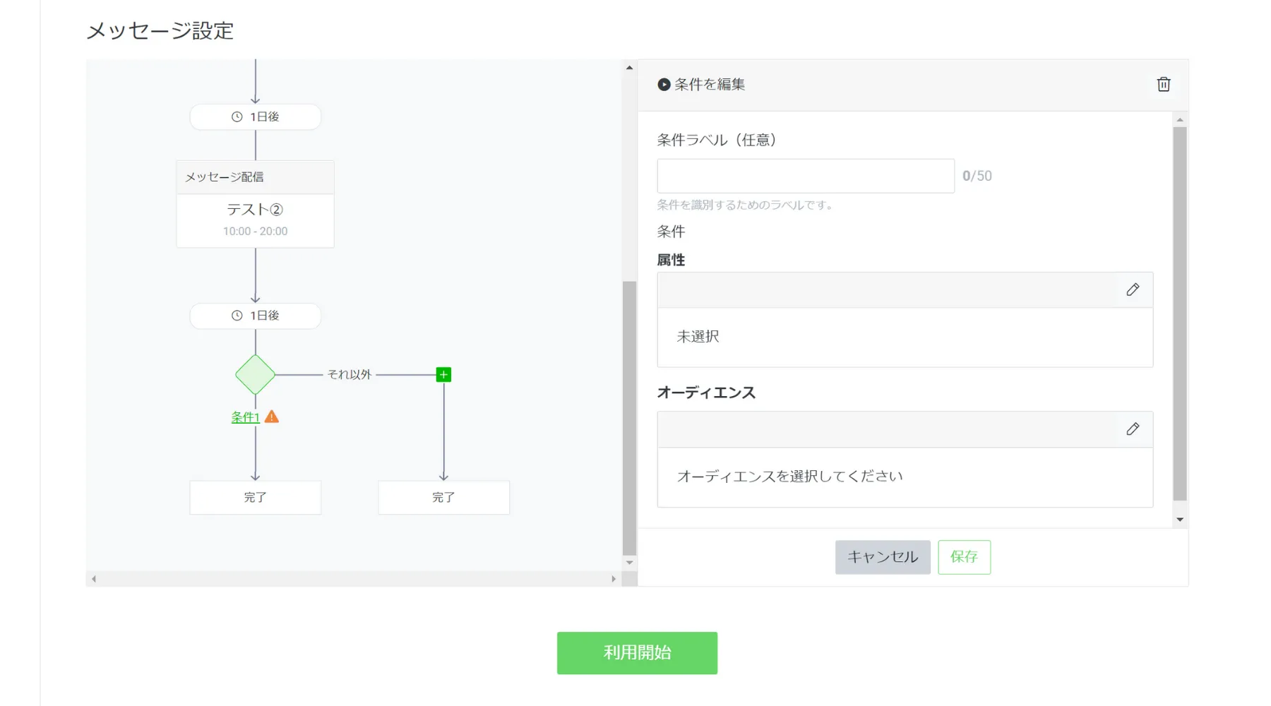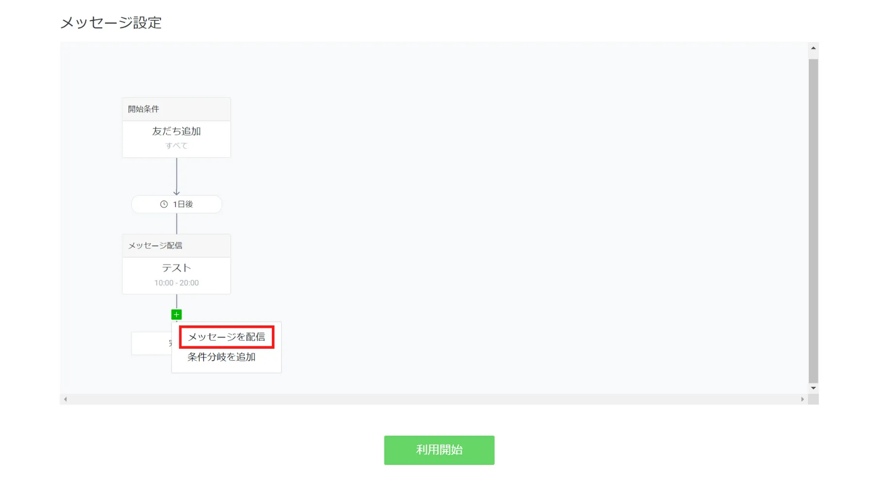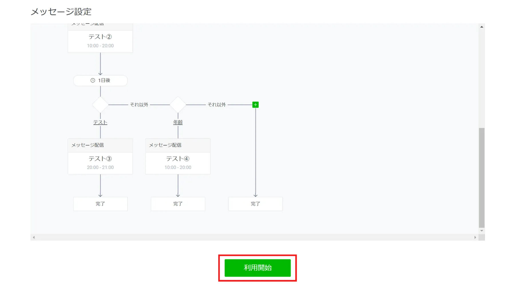 条件分岐はメッセージ配信の設定が完了したら、画面下に表示されている利用開始のボタンをクリックします。以上でステップ配信の設定が完了となり、順次配信が行われます。