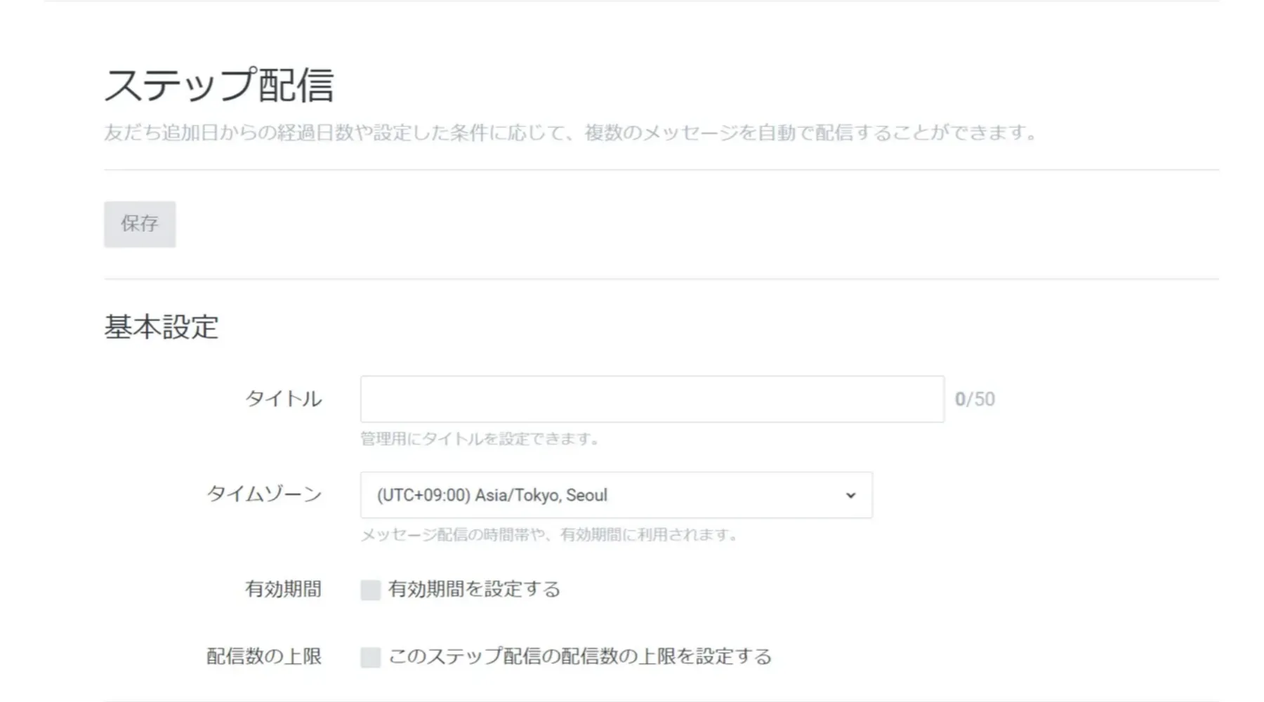 ステップ配信の作成を開始すると、上記のような基本設定の画面が表示されます。管理画面上でのタイトル、タイムゾーン、有効期間、配信数の上限の4つの項目が表示されるため、自信の配信に合わせて設定していきましょう。