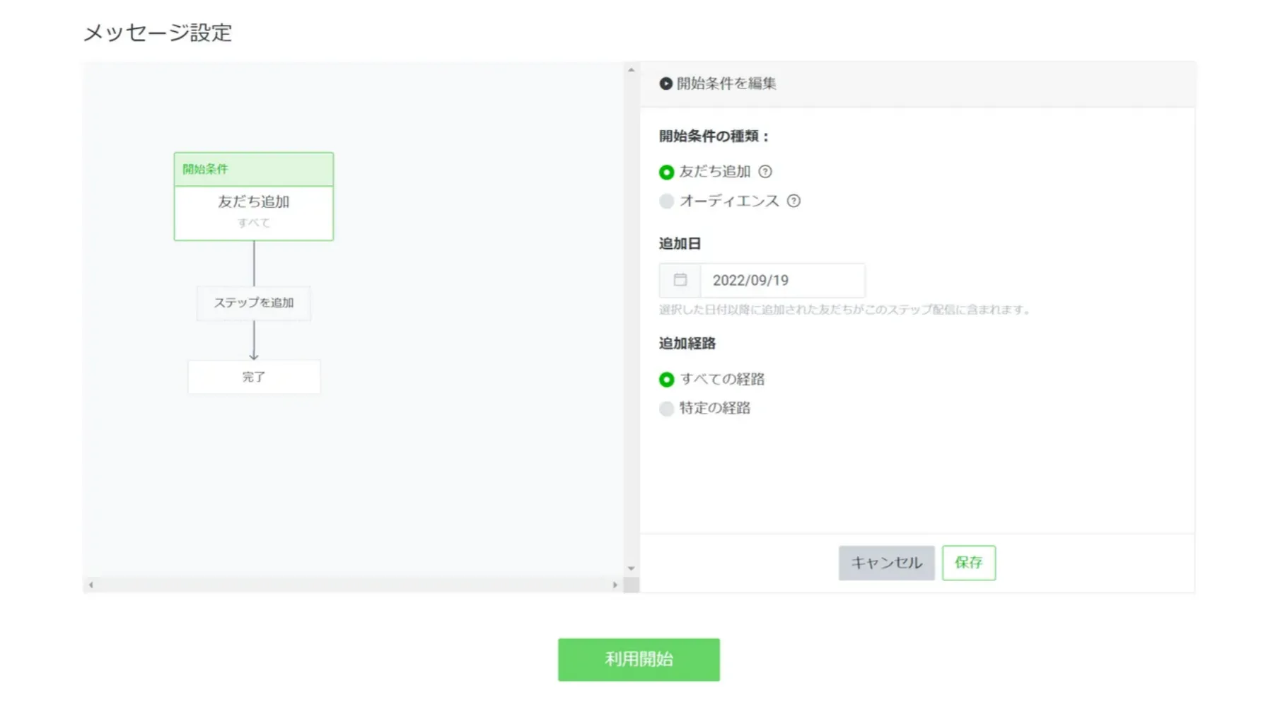 基本設定が完了したら、ステップ配信の開始条件を設定していきます。開始条件の種類は友だち追加とオーディエンスの2つです。