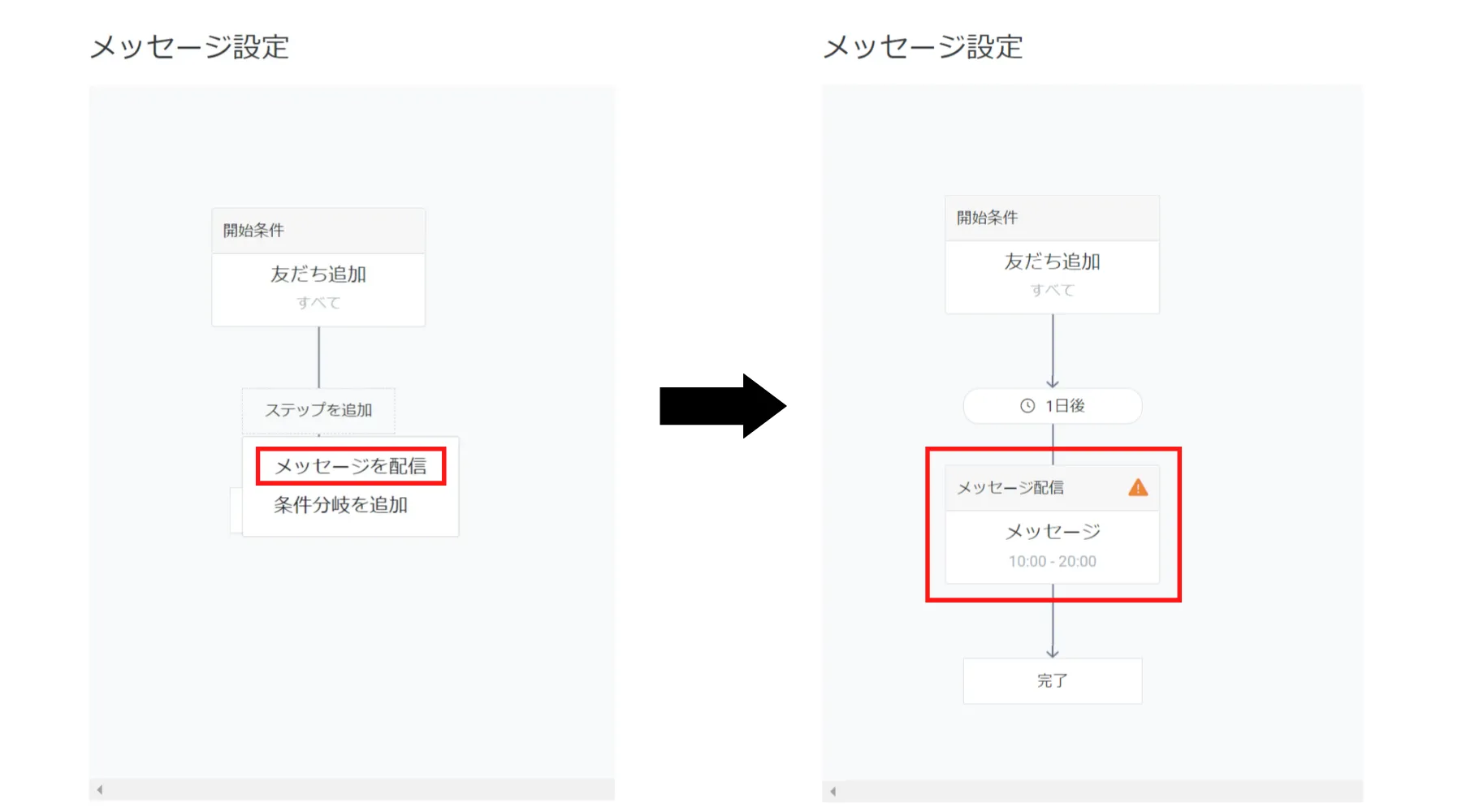 次に「ステップを追加」→「メッセージを配信」の順にボタンをクリックしていきます。そうすると上記画像のように、1日後とメッセージ配信の欄が追加されます。「1日後」のボタンを押すと、日数を変更することも可能です。
