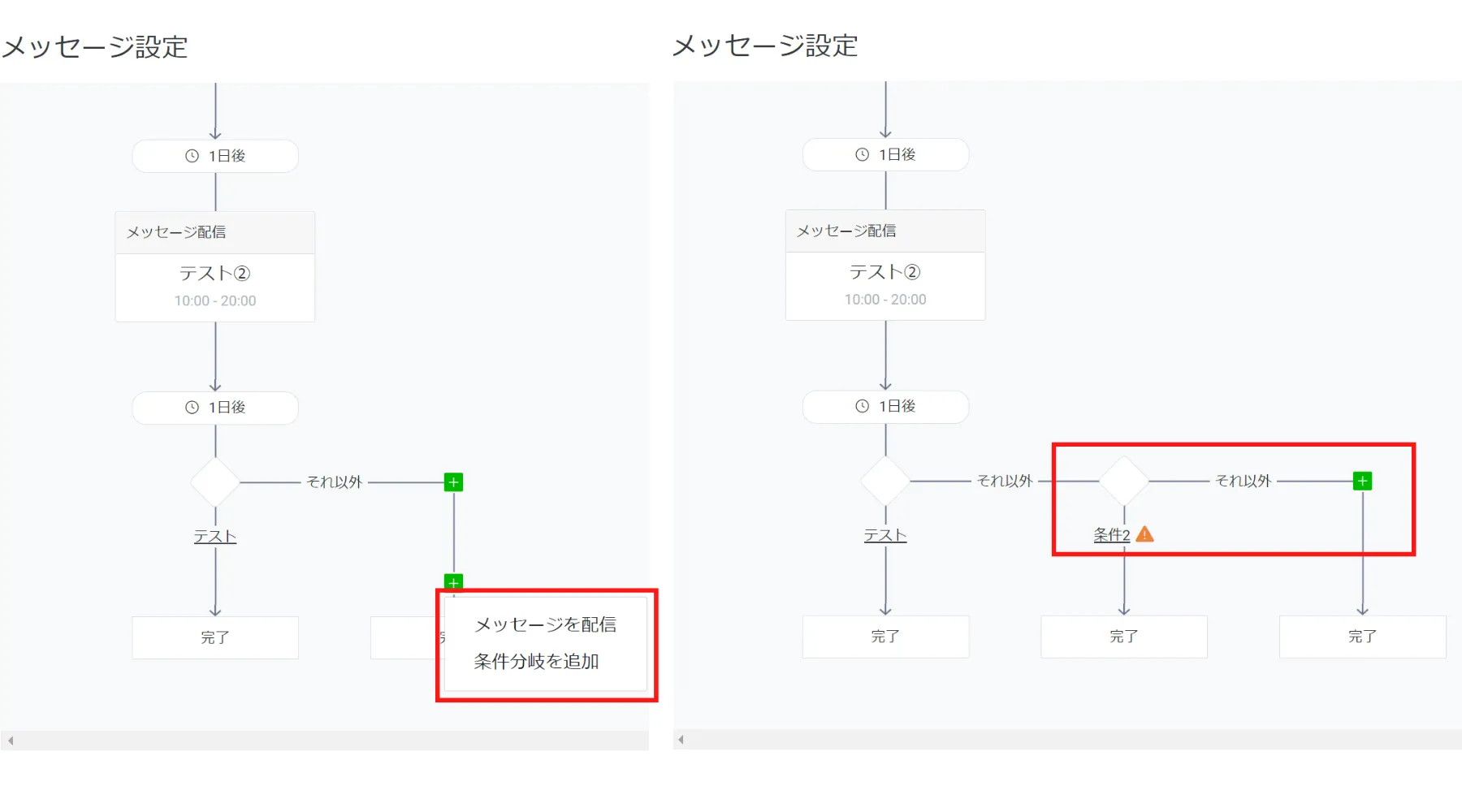 条件分岐をすると、ルートごとにメッセージの配信の設定が可能になるだけでなく、さらに条件を追加することもできます。うまく条件を利用することで、ユーザーのニーズに合わせたアプローチが可能となるでしょう。