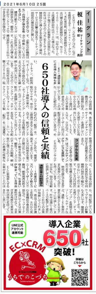 日本ネット経済新聞 EC売上高ランキング号(6月10日発刊号)【2021 Eコマース業界地図[CRM編]】にて弊社マーケティング部部長のインタビューを掲載いただきました。