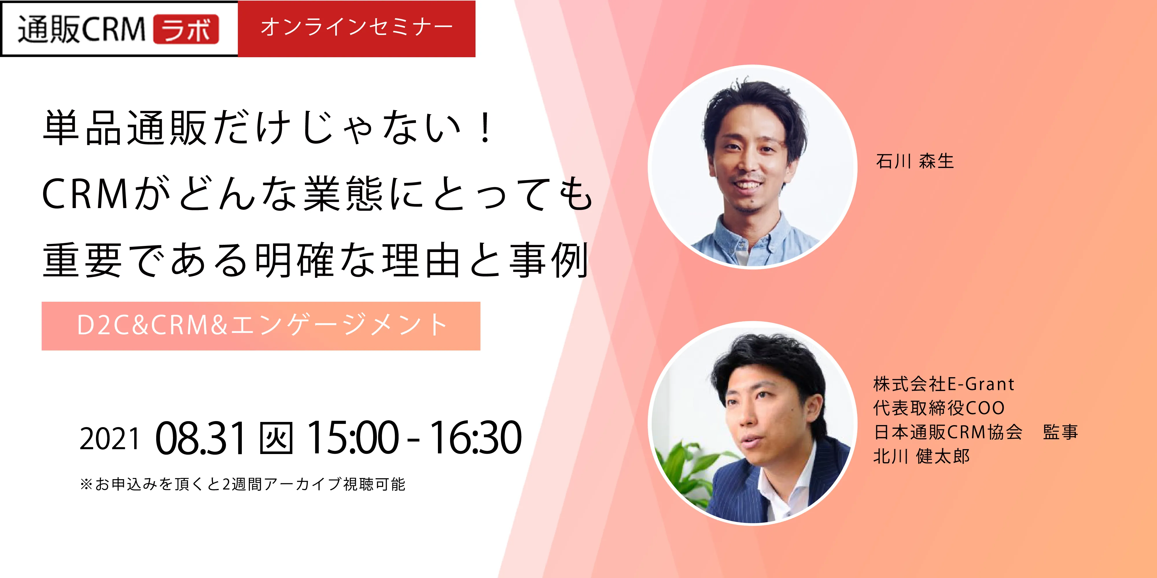 昨今のEC市場においては、広告表現取締強化・cookie規制・他業界からの新規プレイヤー参入など 様々な市場変容に伴い新規獲得効率が悪化の一途をたどっています。 そんな中、大手プラットフォーマーを除き着実に成果を出し続けている企業があります。 それは、LTV・リピート定着率にウェイトを置き戦略的にCRMを構築している企業です。 今回は、多くのEC運営・コンサルティングに従事し、 類まれなる経験と実績から若くして株式会社DINOS CORPORATION CECOを務めておられる石川森生氏をお招きし、 今改めて注目を集めているCRMについて、その重要性とメリットをEC経営者の視点からトークセッション形式にて お話しさせていただきます。